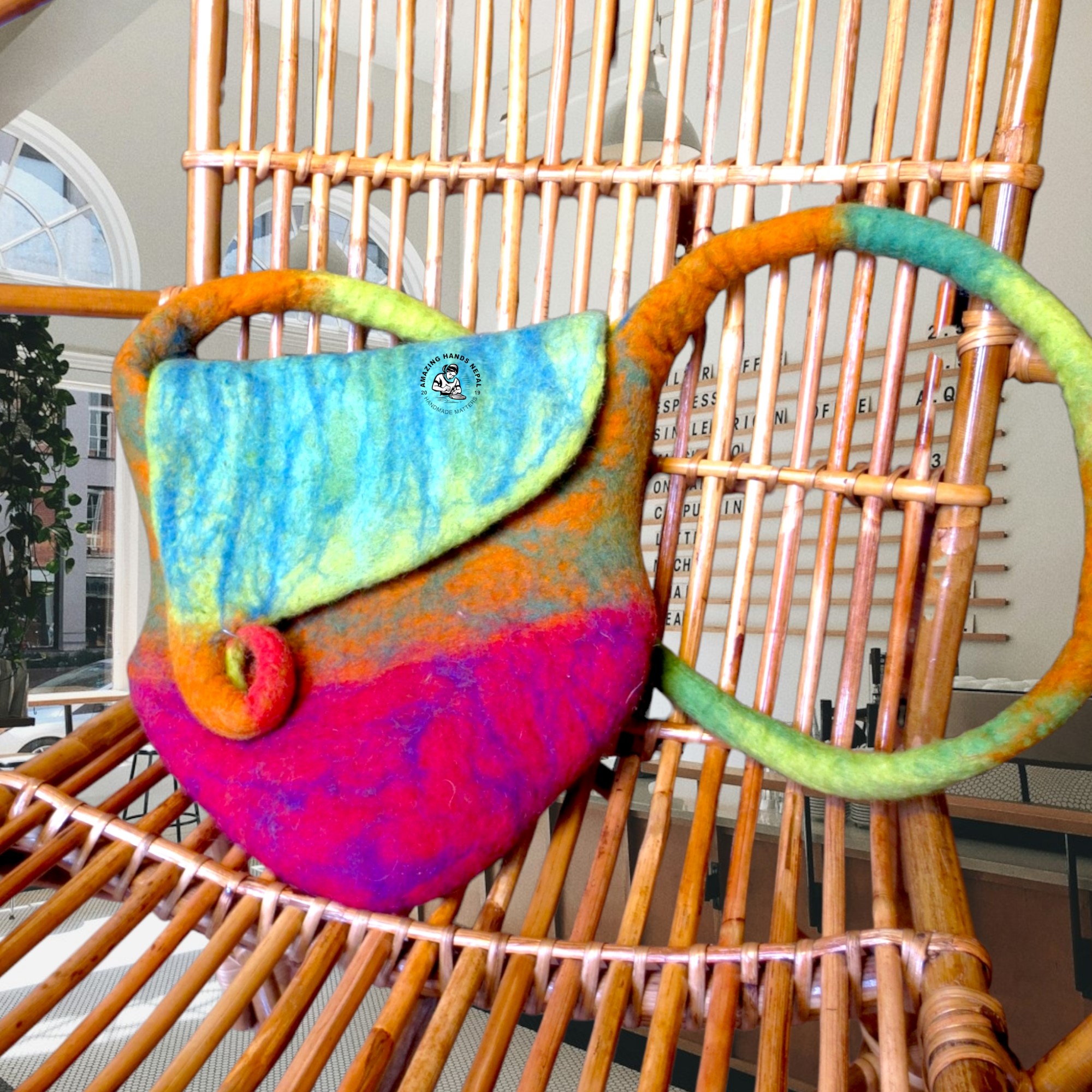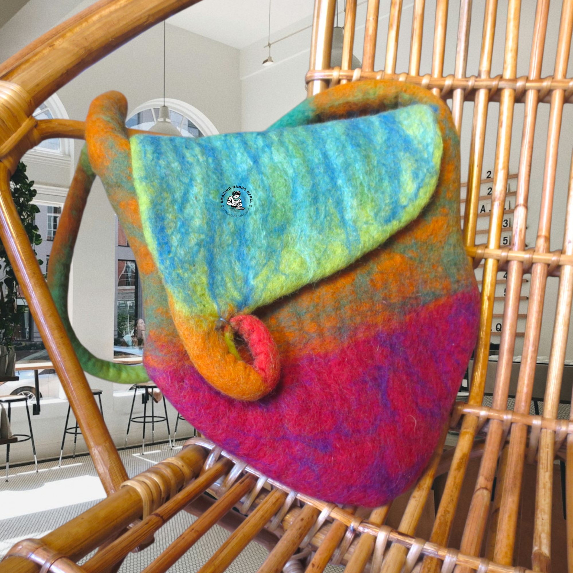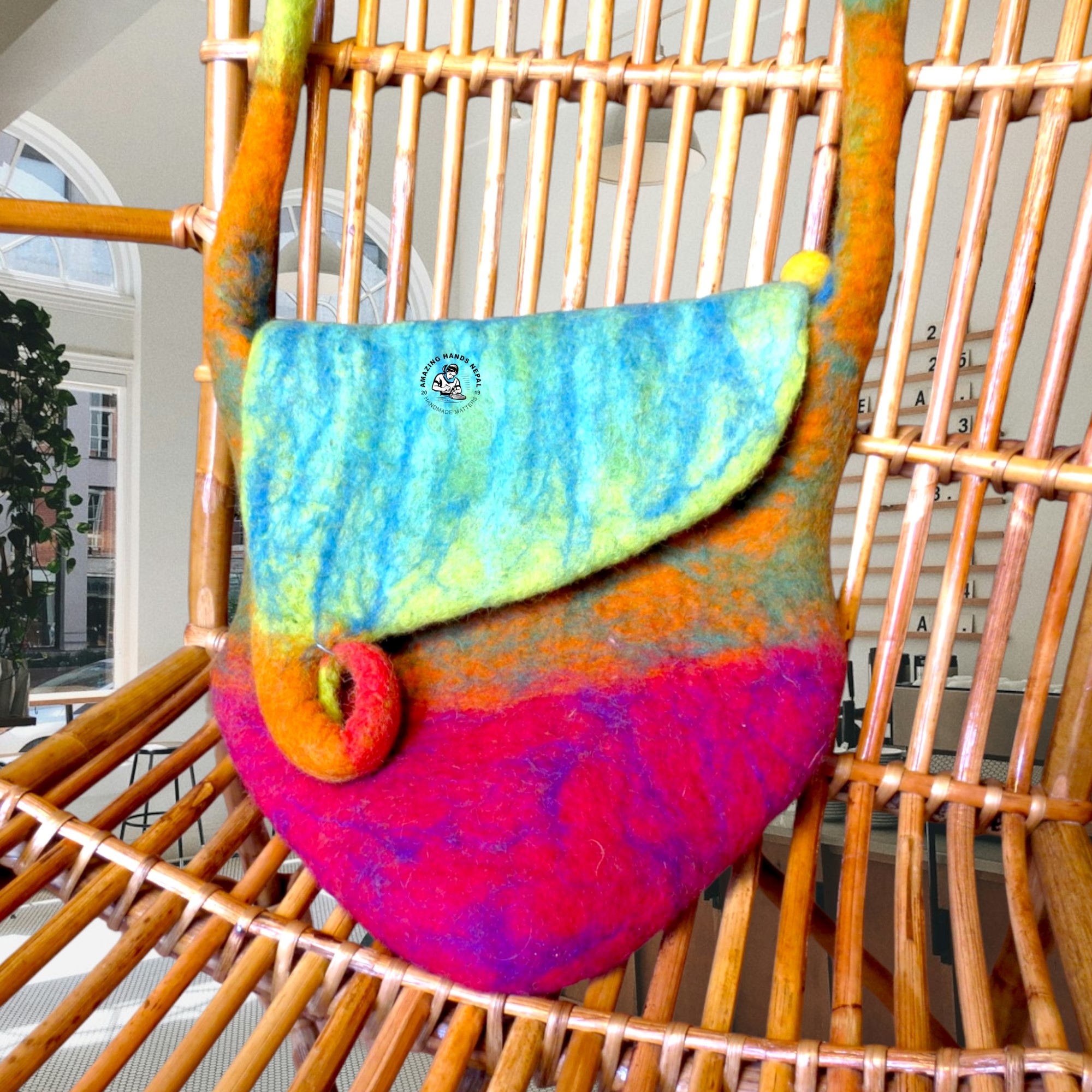 This special beach bag has been handcrafted from 100% natural New Zealand wool/felt. This shoulder or crossbody bag has a unique, colorful design offering you a dashing look while traveling. This bag features a vibrant, multi-colored design with a flap closure and a decorative element on the front. It has a casual, artistic aesthetic, and could be used as a unique accessory. Highly skilled women artisans in Nepal make this bag by using eco-friendly materials.