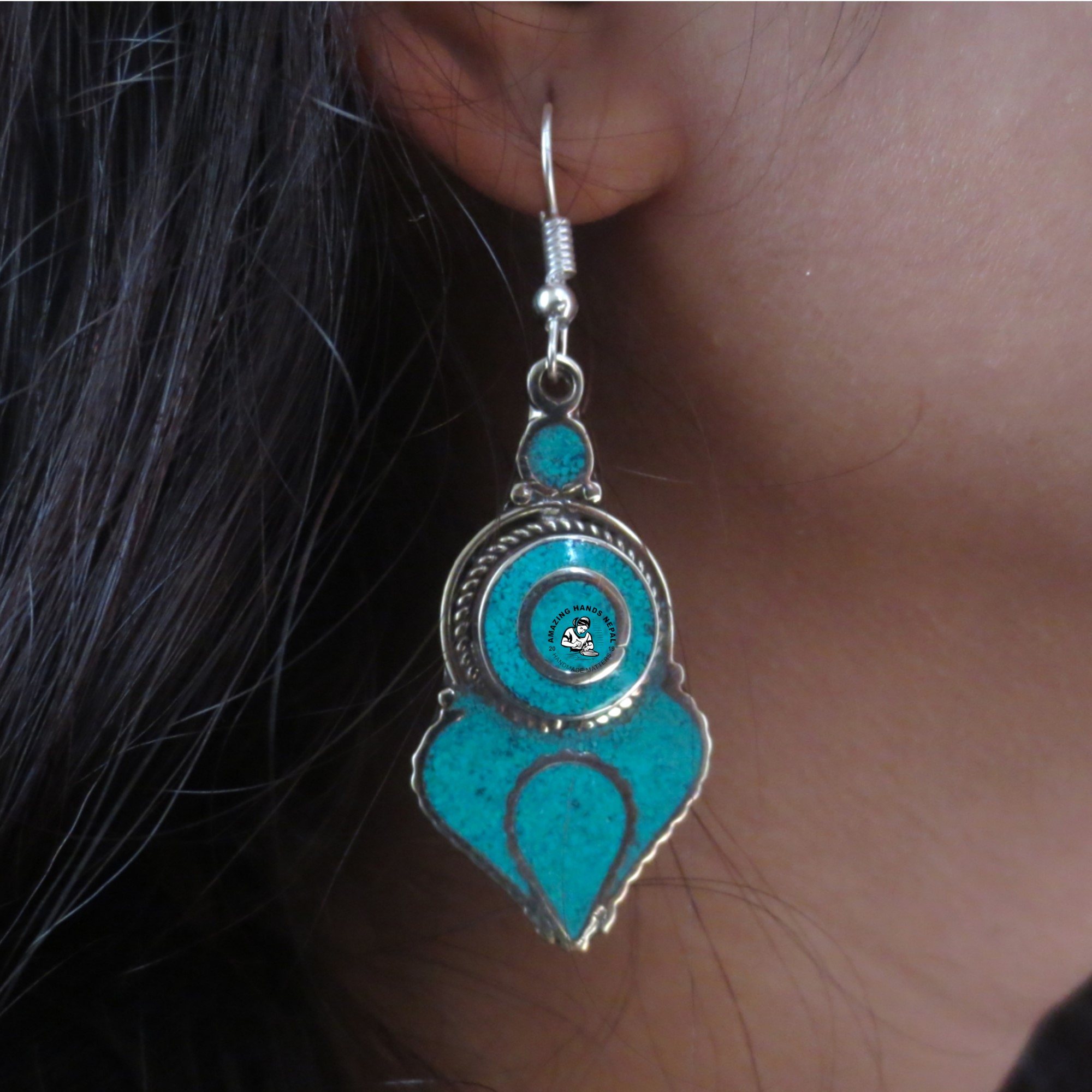 Our turquoise Tibetan fashion earring features a turquoise stone inlaid on a silver-toned white metal This earring offers a bohemian or tribal style, incorporating multiple shapes, including a circular element and a larger, ornate lower section. The turquoise stones are a prominent feature, adding a vibrant blue-green color to the piece. Its distinct shape and deep turquoise color make it a perfect artistic craft for every outfit, giving you an elegant look in your friends’ circle. In Tibetan Buddhism, turquoise stone offers a variety of goodness. Buy Our Turquoise Tibetan Fashion Earring In Wholesale Price. If you are a wholesaler or a distributor in your country, please send us an enquiry HERE to get the best WHOLESALE PRICING! Also, check out our PARTNERSHIP POLICY for bigger DEALS. You can also support us by SUBSCRIBING to our YouTube Channel where we put a lot of videos and stories about our crafts and communities. Similarly, if you have an interest in learning more about Nepalese Handicrafts and want to get updates on our new products, please feel free to join our Nepali Handicrafts Community on Reddit.